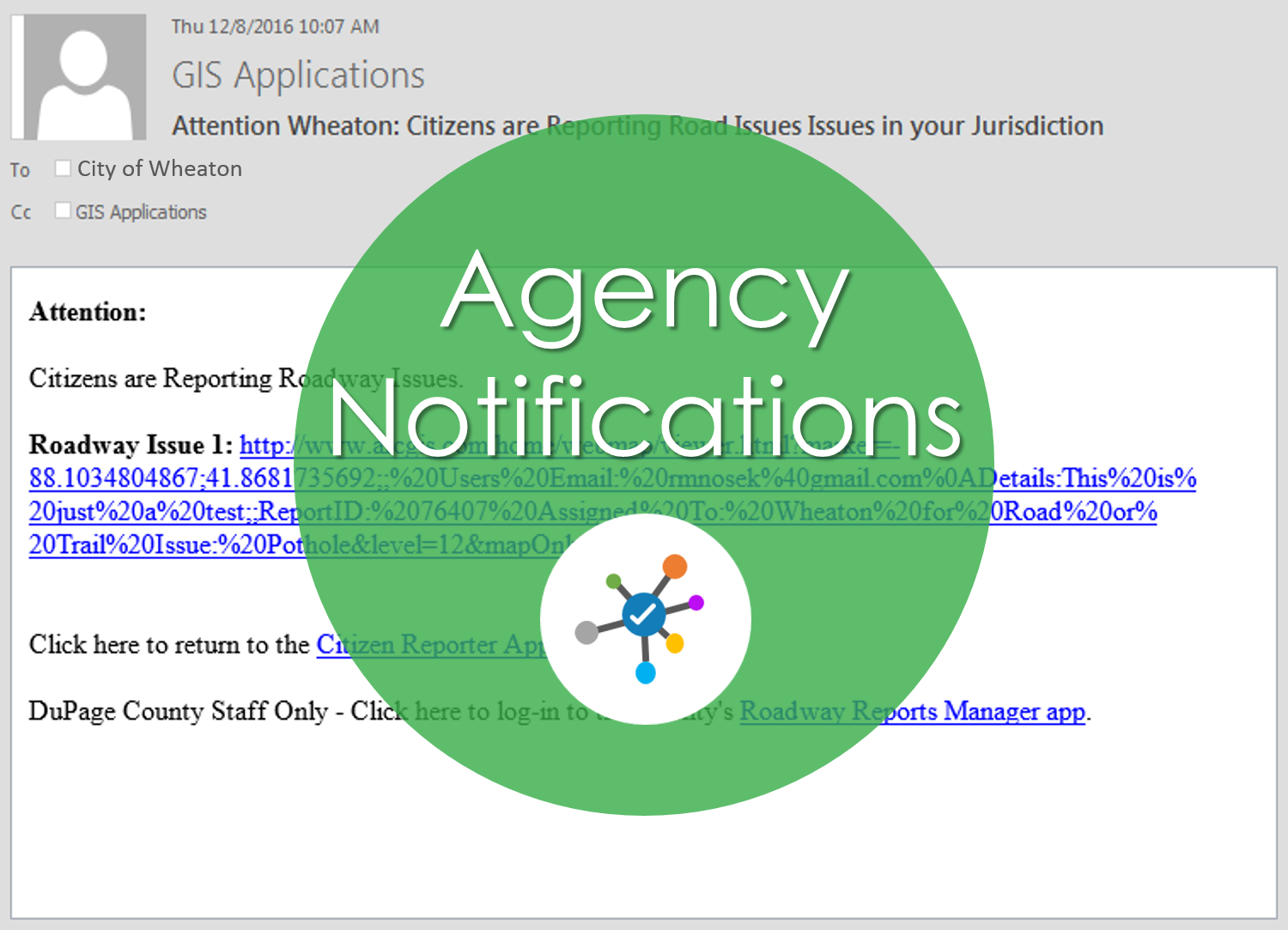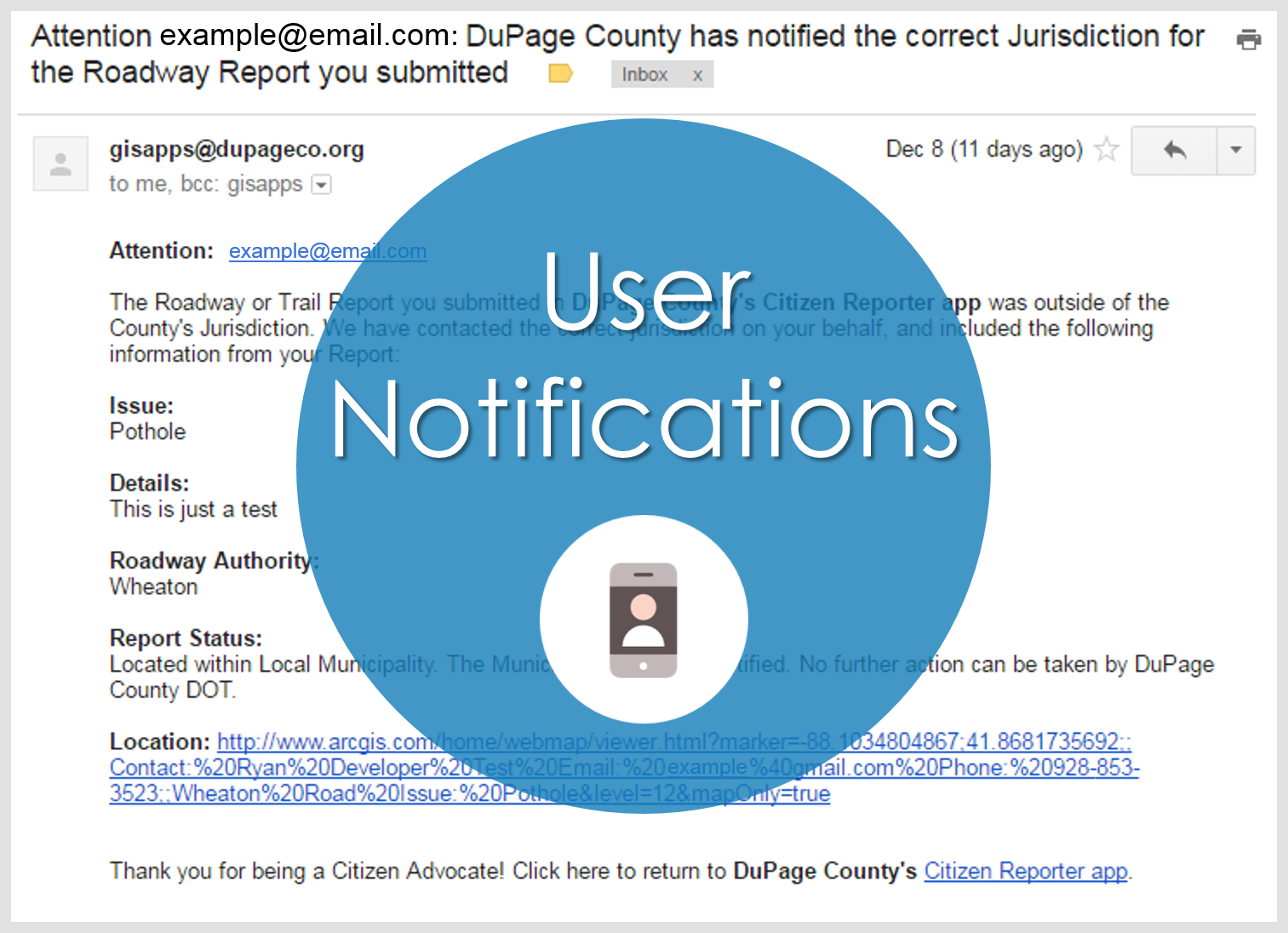 For Roadway Reports, we will notify participating* Roadway Authorities if it is determined the issue is outside the County's Jurisdiction. We'll also let the User know if their Report is being forwarded to a participating Roadway Authority.